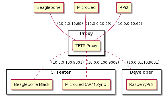 A network connected board with a suitable boot loader such as U-Boot is configured to boot using TFTP. The boot loader’s configured TFTP server IP address is the address of the host computer running the TFTP Proxy server or the proxy. The TFTP Proxy runs as root or an administrator as it binds by default to the default TFTP port of 69.